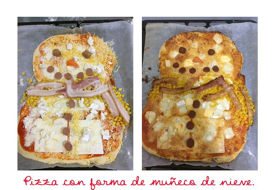 Hace unos dias os enseñe por instagram una cena muy invernal y que muchos me pedisteis la receta por privado pues aqui esta , pizza de quesos con forma de muñeco de nieve.
