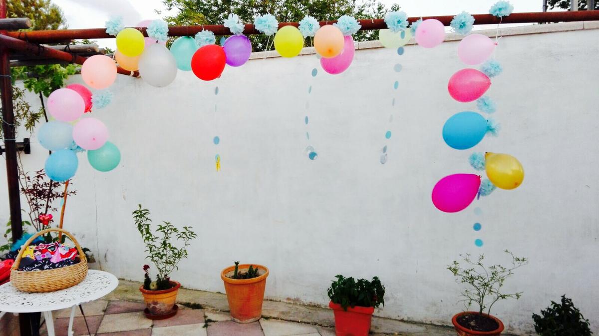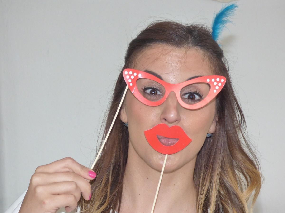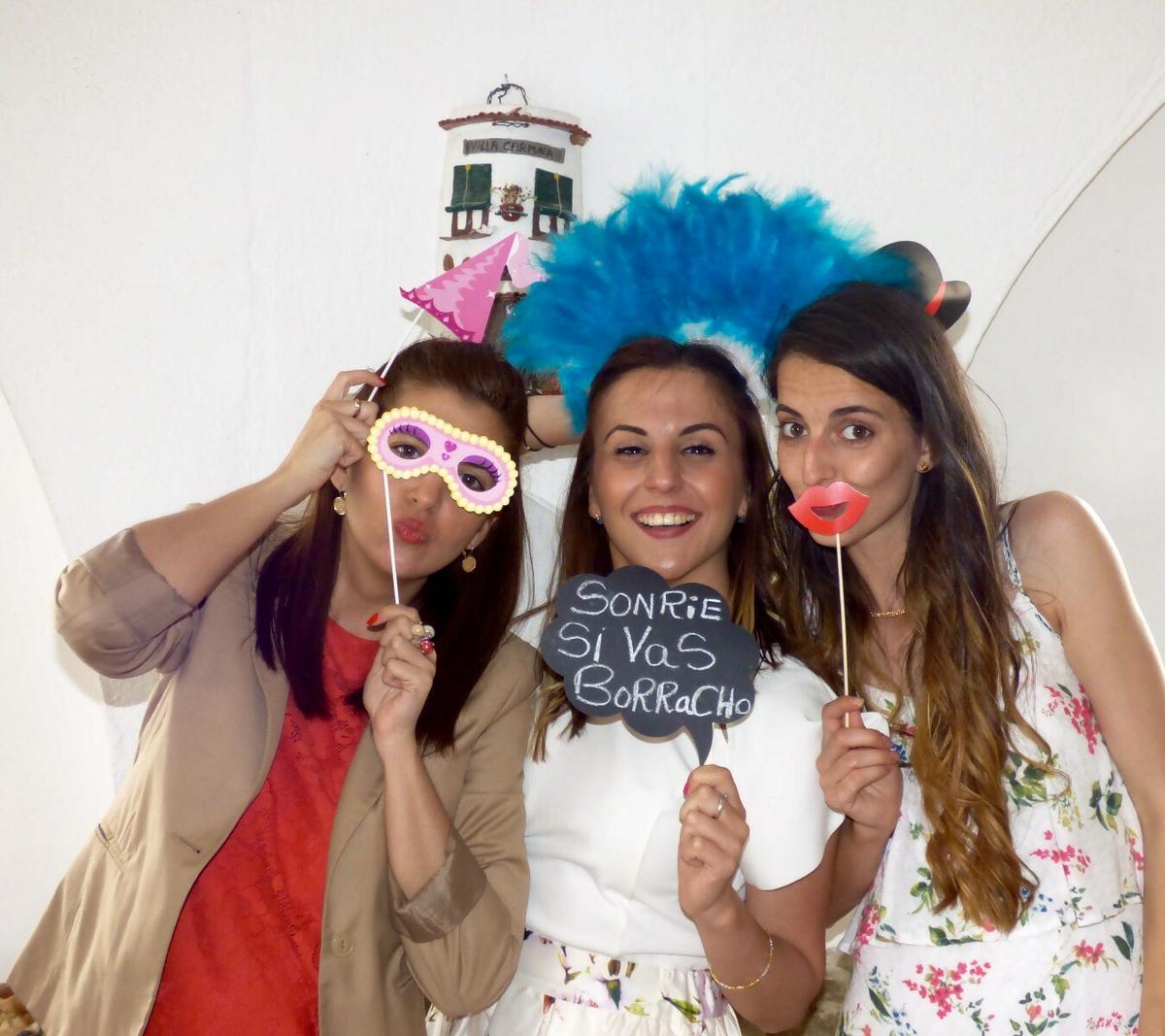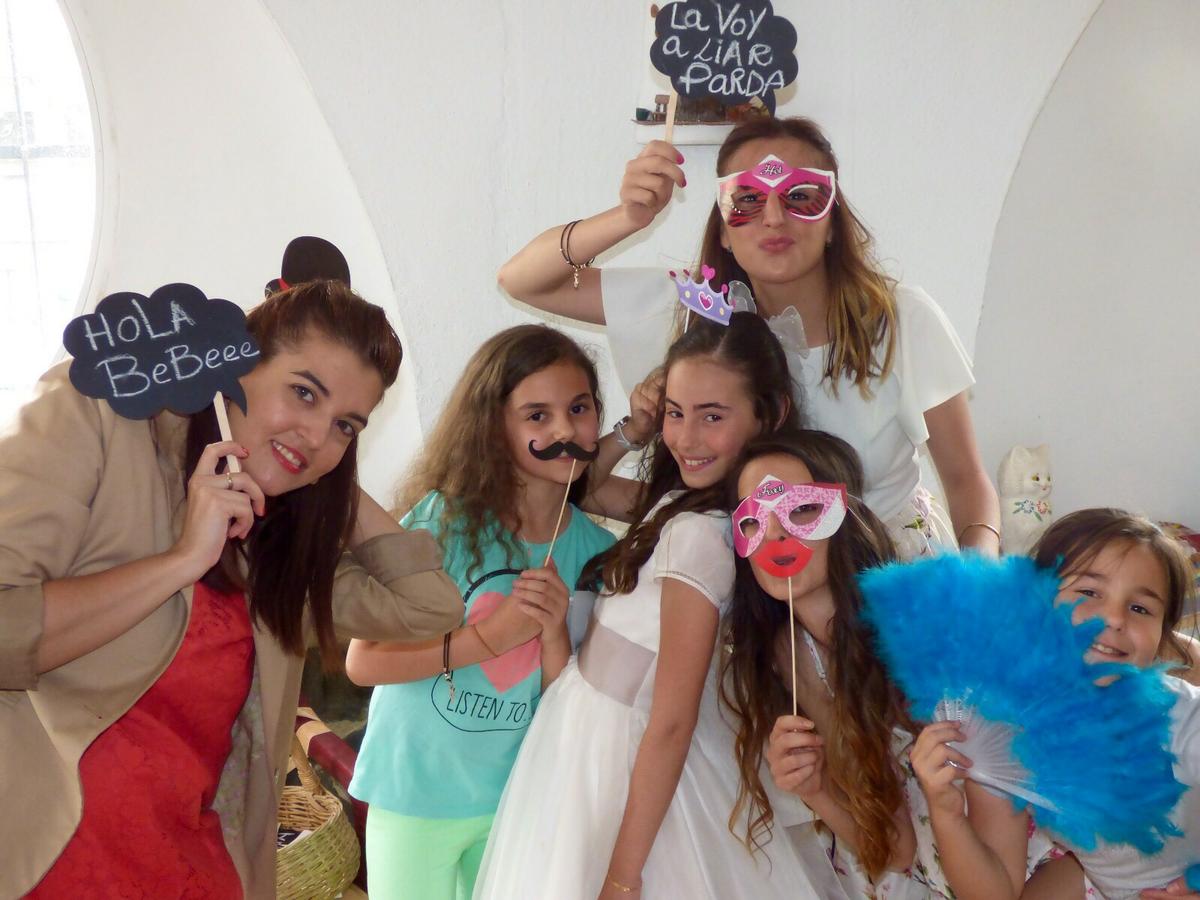 Al ser celebrada en una casa de campo, teníamos muchísimo espacio disponible para organizar, entonces pensamos también en realizar un photocall, tanto para los mayores como para los niños. Lo decoramos con guirnaldas azules, lluvia de circulos y muchos globos para darle color. Al lado dejamos la cesta con todos los accesorios (máscaras, gafas, besitos, pajaritas, sombreros, abanicos de plumas, pizarras con frases, etc.) para que pudieramos hacernos las fotos. (Para ese día el tiempo no acompañó y tuvimos que recoger la lluvia de círculos para que no se enredaran). ¡Aunque como veis no nos importó mucho el clima porque salieron como unas 100 fotos para el recuerdo!
