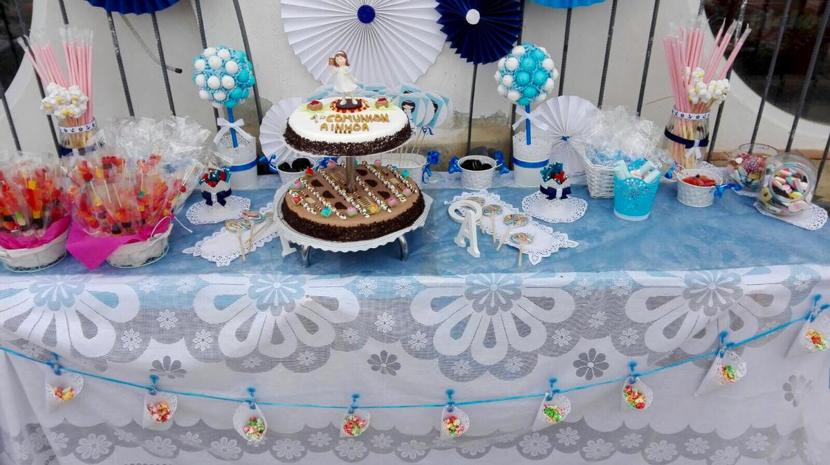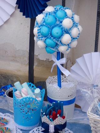 Una vez que colocamos las mesas, optamos por unos manteles rosa palo para las mesas de adultos, mientras que para las mesas de los niños optamos por color gris plata. En los centros de mesa, unos jarrones artesanales rústicos con flores del campo. El color predominante de casi toda a temática fue el azul, ya que a la niña le encanta. Tanto la mesa de chuches y parte de la decoración eran de ese color .