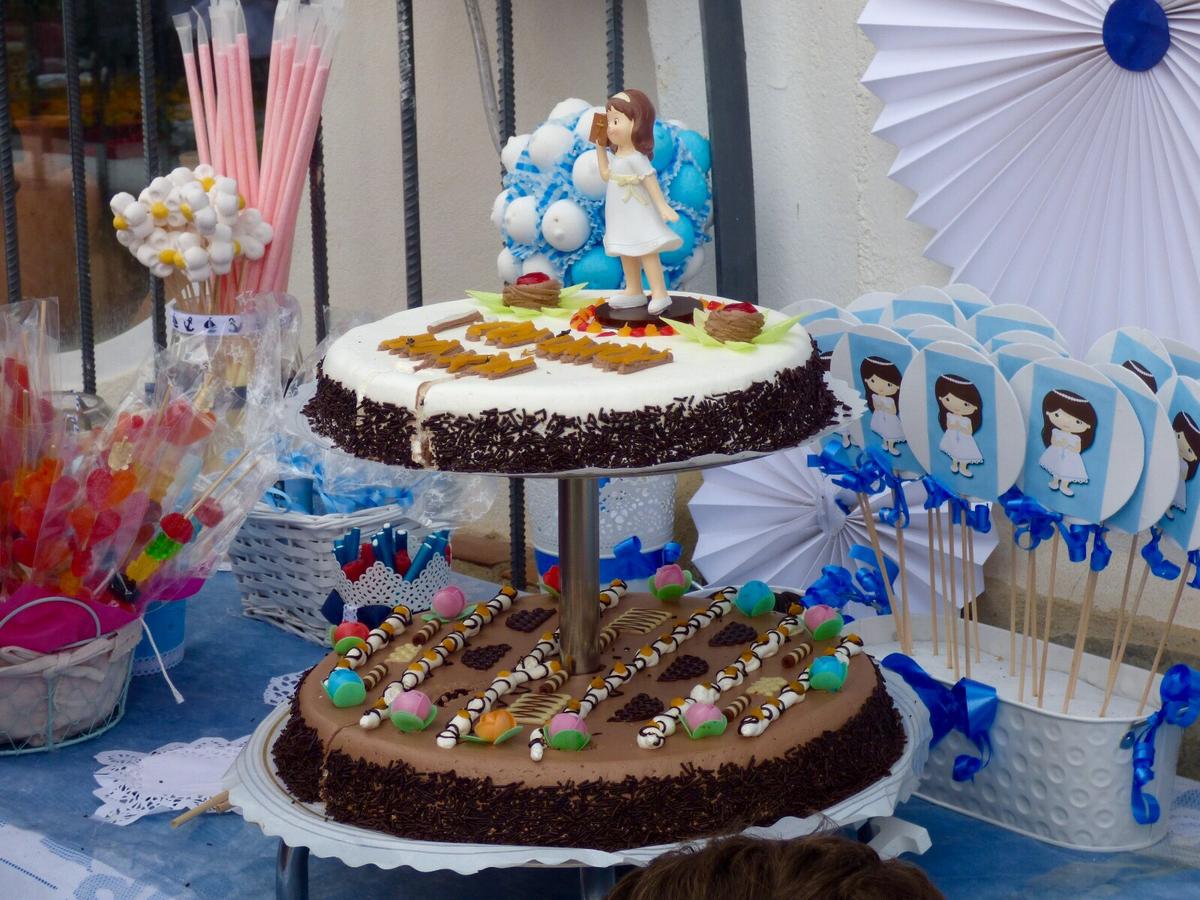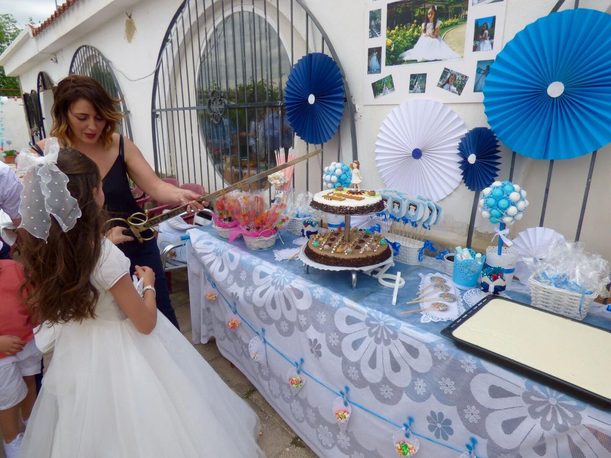 La comida, encargada a un catering, estaba buenísima, con el plato principal del menú, la paella, ya se nos hizo la boca agua y la mesa de dulces era preciosa, que fue la delicia de pequeños y de mayores. Decorada con su nombre y fotos de la princesita, la tarta de chocolate y nata como la gran protagonista de la mesa, y alrededor piruletas, árboles de nube, brochetas de chuches, etc.