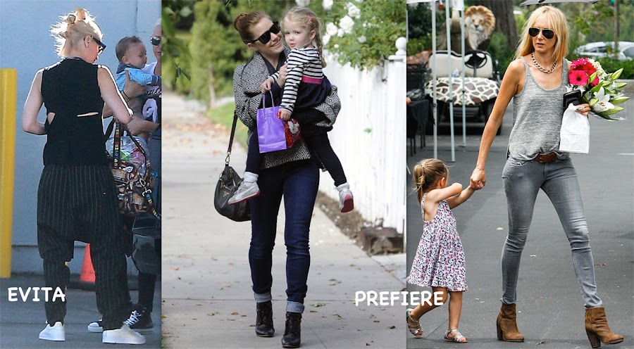 Si todas empezamos a usar pantalones anchos, con pliegues, harem pants, los que compraste en un mercadillo de cuzco, los playeros o peor seguimos usando los jeans ultracadera perjudicando nuestra imagen totalmente. Cambialos por jeans a la cintura o semi caderda sin ningún pliegue, bolsillos clasicos y no focalizados. Tambien los skinny jeans dentro de los botines ayudan a estilizar. ¿Más inspiración? Ve la galería de fotos de Mamás en Jeans y Flats.