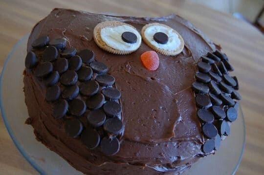 El búho es más sencillo aún. Recorta el bizcocho en forma de U abierta en la parte que serán las orejas del búho. Luego añade pequeños círculos de color negro simulando sus alas. Con una galleta tipo oreo abierta y un poco de fondant negro serán los ojos. Por último, añade para el pico una gominola.