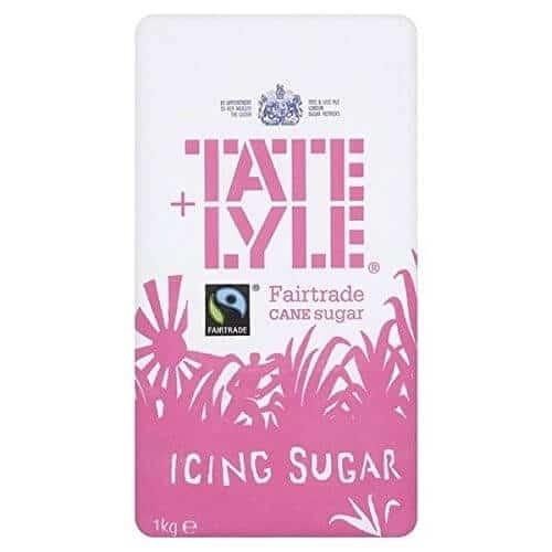 El azúcar glas que uses debe ser extrafino, eso solo lo he conseguido comprado y una marca muy determinada Tate & Lyle. A pesar de esto, debes tamizar el azúcar antes de incluirlo en la mezcla.