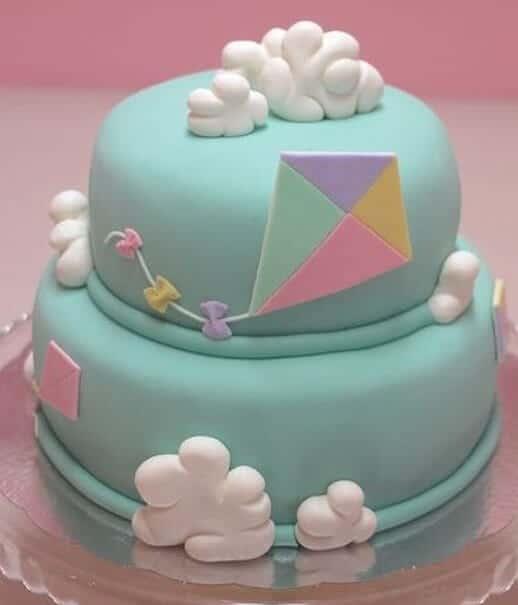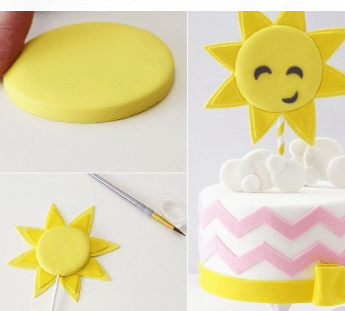 Cubierta de fondant y decoración sencilla. Puedes añadir una cenefa, al rededor de la tarta, con ayuda de un molde de silicona o cortador y un sol, nubes o simplemente la edad del pequeño. Te dejo esta sencilla propuesta: