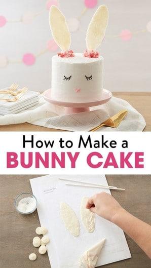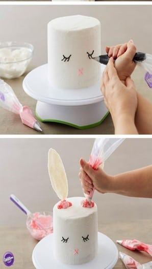 La propuesta es hacer unas orejas de conejo con candy melts blanco y coco (o sprinkles blancos) para el centro. Posteriormente, usa candy melts negros (o glasa negra de consistencia densa) y una manga, para hacer la boca y los ojitos en el ancho de la tarta y “tadaaaaa”. ¿Bellísima verdad?