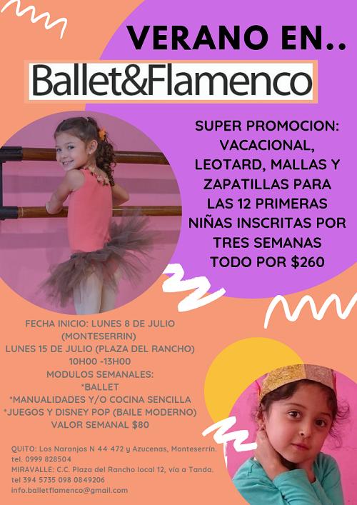 Horario: 10AM a 1PM. Módulos semanales. Actividades: Ballet, manualidades y/o cocina, juegos, Baile Disney Pop. Precio por semana: $80. Contacto: info.balletflamenco@gmail.com Telf: 394 5735 / 0980849206 ** Promoción mallas, leotard y zapatillas para las 12 primeras inscritas x3 sem por $260.