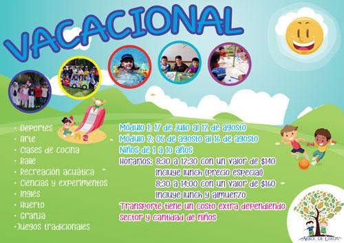 Sector: Tumbaco. Vacacional de verano 2019 Árbol de Lmón ofrece divertidas actividades para chicos y grandes, y cuentan con instalaciones adecuadas para que los niños pasen momentos inolvidables en sus verano 2019 escolar. Allí podrán hacer nuevas amistades, desarrollar intereses y pasatiempos, potencializar sus habilidades en un ambiente seguro y relajado. Primero módulo: 17 de julio al 2 de Agosto Segundo módulo: 05 al 16 de Agosto. Horarios y valores: