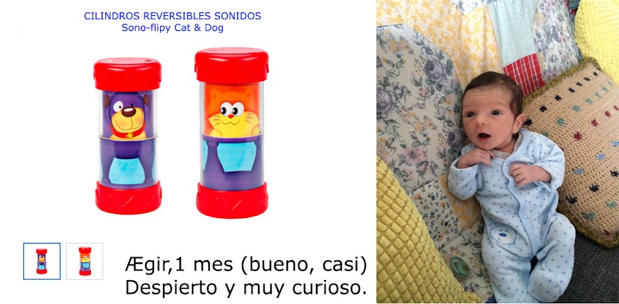 Para el pequeño Aegir, como solo tendrá dos mesecitos para esas fechas, he elegido este cilindro de animalitos que suenan cuando los volteas de arriba abajo y seguro que despierta su curiosidad, ¡es tan llamativo!.
