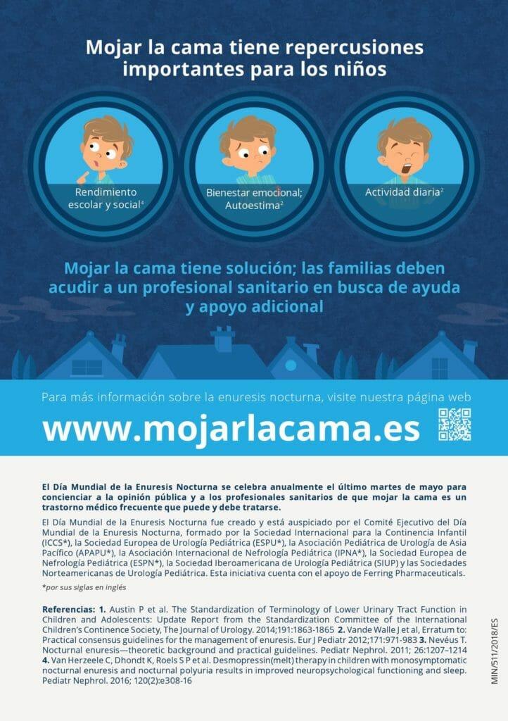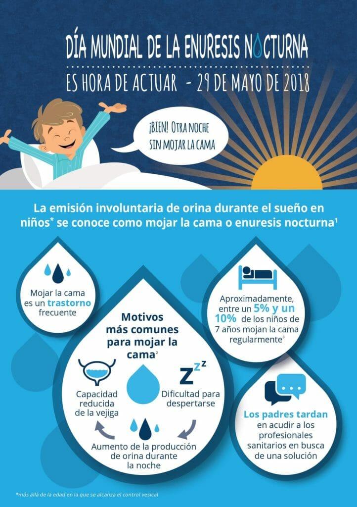 La Sociedad Internacional de Continencia Infantil (ICCS), la Sociedad Europea de Urología Pediátrica (ESPU), la Asociación de Urología Pediátrica de Asia y el Pacífico (APAPU), la Asociación Internacional de Nefrología Pediátrica (IPNA), la Sociedad Europea de Nefrología Pediátrica (ESPN), la Sociedad Iberoamericana de Urología Pediátrica (SIUP), y las Sociedades de Urología Pediátrica de América del Norte han designado hoy, 29 de mayo, día mundial de la enuresis 2018 (efemérides que coincide cada año con el último martes de mayo), para concienciar a la población y a los profesionales de la salud de que la enuresis es una afección médica común que puede y debe tratarse.