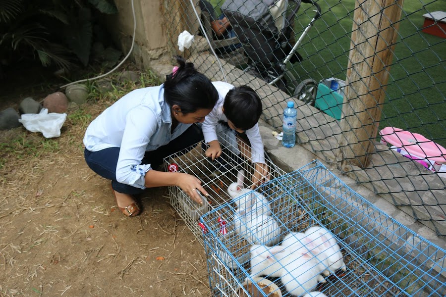 Sebastian se divirtió con la mini granjita dónde sólo habían animales pequeños como conejitos y cuyes. Hay un área de juegos para niños menores a 3 años, ya que son pequeños y en el jardin principal hay juegos inflables, camas saltarinas y más.