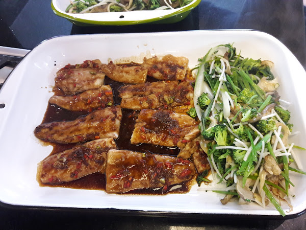 4. Servir el pescado con la cebolla acompañado de los vegetales y decorar con la cebolla china picada.