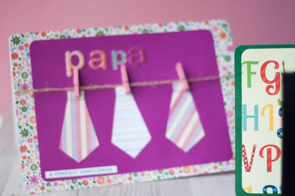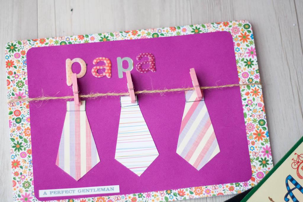 Con distintos estampados (pero siempre coordinados) recorta tres corbatas y pegalas sobre la cartulia lisa. Yo he repetdo uno de los estampados para no crear mucho “desorden” ya que el estampado del fondo tiene un patrón muy pequeño.