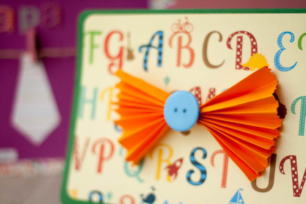 Para la pajarita he plegado una hoja de color naranja y sobre ella he puesto con la pistola de silicona un botón.
