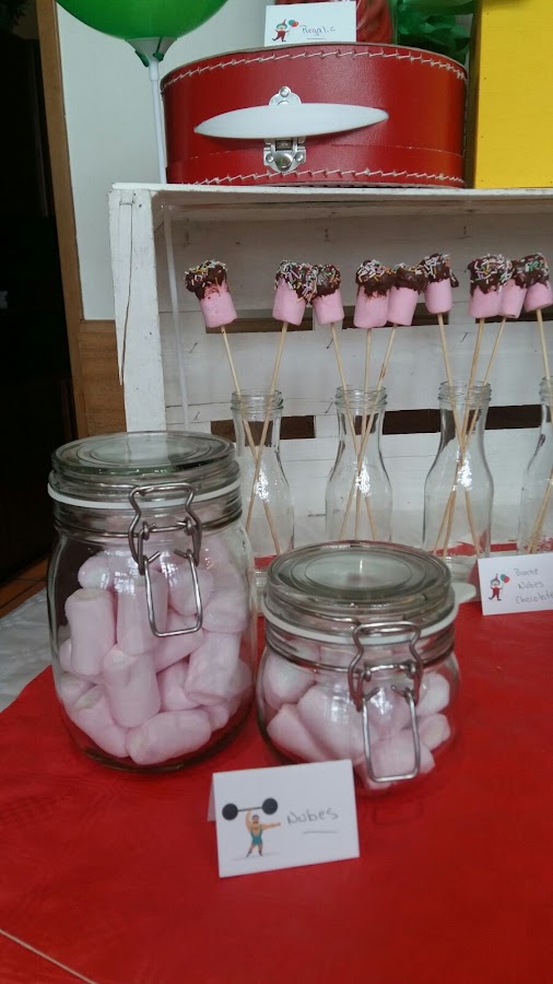 Mentiría si digo que no improvise, lo hice, y mucho, estas botellitas por ejemplo iban a llevar unas etiquetas y las rellenaría de bebida de colores pero no me dio tiempo y al final quedaron súper bonitas como bases para estas brochetitas de nubes con chocolate que son súper fáciles de hacer: pinchas la nube con la brocheta, la mojas en chocolate derretido a baño maría y lo rebozas con chispitas de colorines.