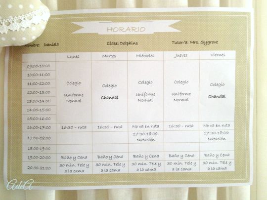Así que he diseñado unos horarios en los que podemos apuntar todo, desde que uniforme se tiene que poner, hasta a qué hora tiene las extraescolares o las rutinas de cena, baño y tele, por ejemplo.