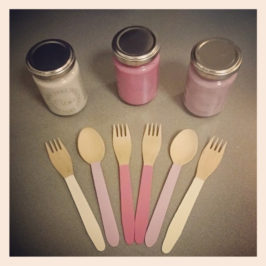 Por último, pinté los cubiertos de madera. Eran muy monos, pero me parecían algo sosos, así pues pinté los mangos en blanco, rosa clarito y fucsia con Chalk Paint Fleur* Chalk White, Babydoll Silk y American Beauty.