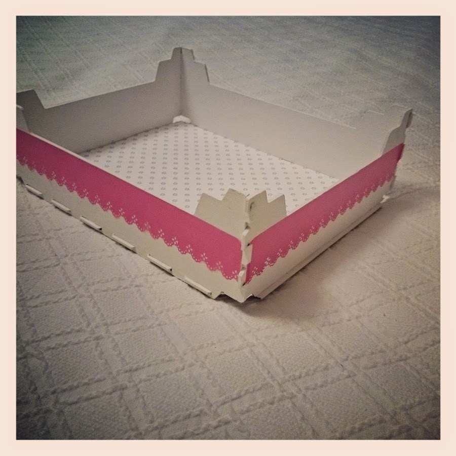 Después forré la base con un papel con dibujitos en rosa y blanco.