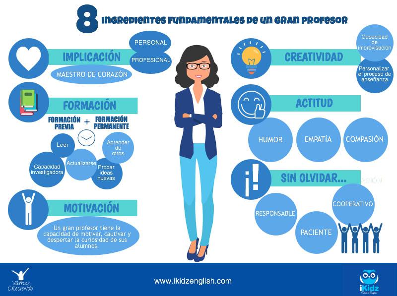 Hoy os quiero dejar un infográfico con las características que, desde mi punto de vista, debe tener un gran profesor y, por tanto, las características que nosotros buscamos en los profes que quieran abrir su propia academia iKidz.
