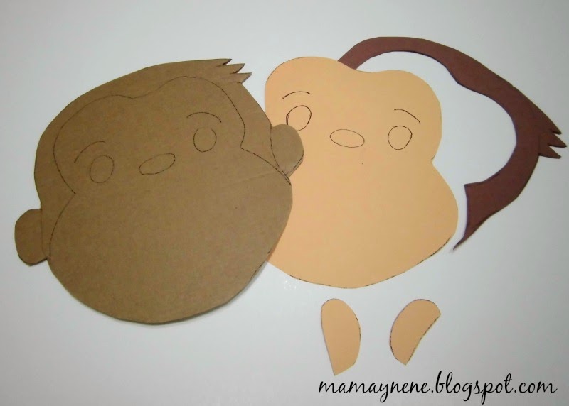 Armamos la carita, retocamos los ojos y cejas con plumón negro, pegamos la boca que armamos donde corrresponde y finalizamos dibujándole una sonrisota de felicidad a nuestro monito.