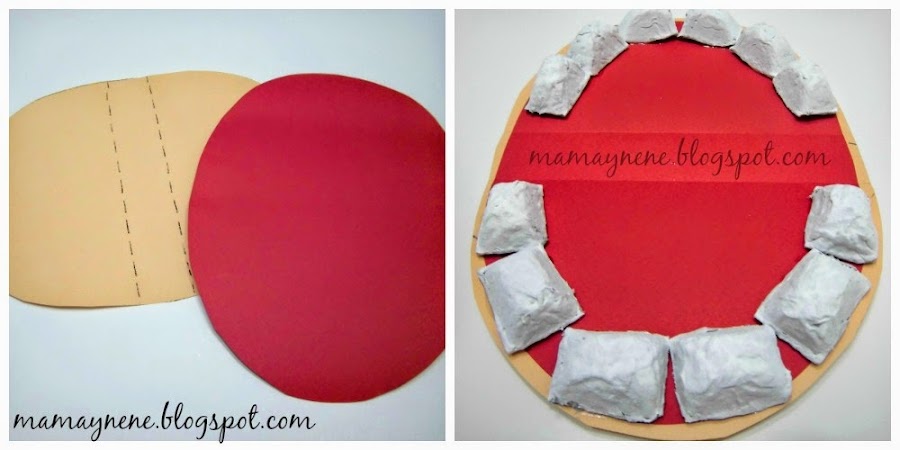 Pintamos los pedacitos con témpera blanca y ya tenemos unos lindos y sobretodo resistentes dientecitos. La boca, la elaboramos con dos óvalos de cartulina, de color piel y rojo, corta la cartulina roja ligeramente más pequeña para simular el interior de la boca. Con el pegalotodo, armamos todo conforme se muestra en la foto. El molde de la boquita te lo dejo aquí, sobre las líneas segmentadas debes realizar el doblez.