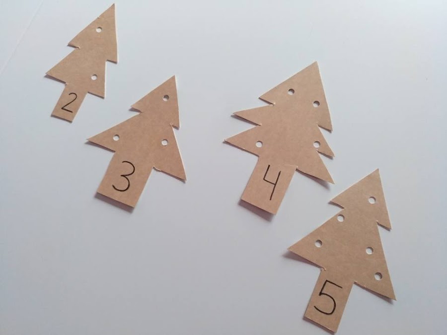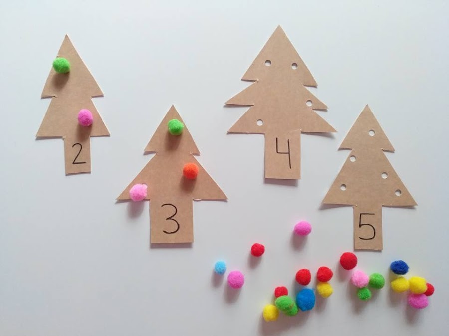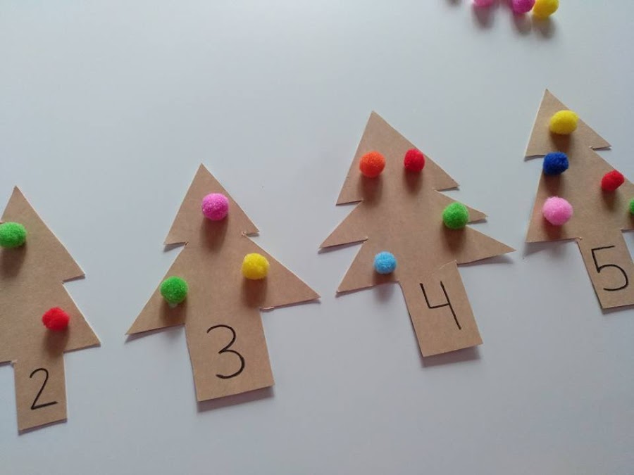 Tenemos elegir un número, buscarlo entre los árboles y colocar tantas bolas (pompones) como el número indica.