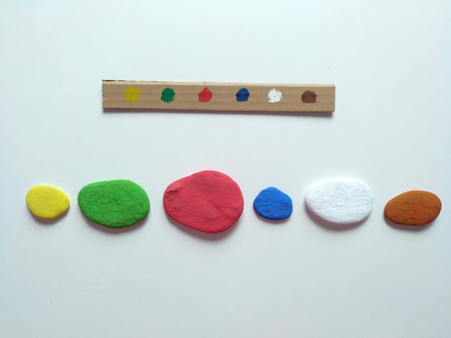 Actividad 2. Hacer series. He pintado en una tira de cartón tantos puntitos de colores como piedras tenemos. Los peques deben colocar,en la parte inferior de la mesa, las piedras en el orden que se les indica.