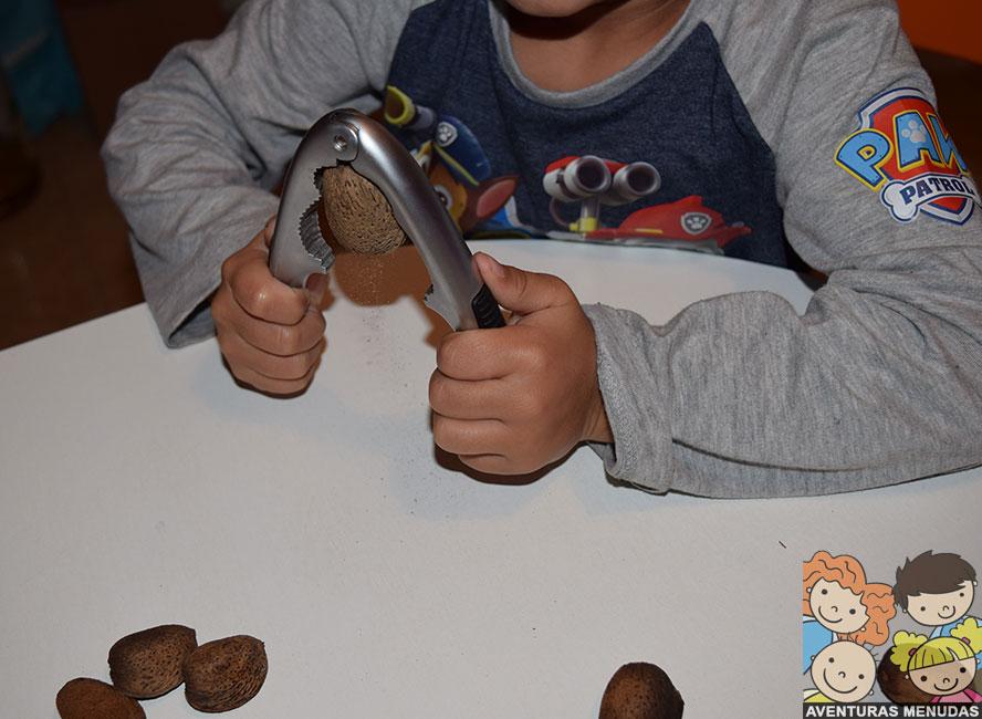 Con un abre nueces que tenemos por casa, fueron abriendo cada una de las almendras.