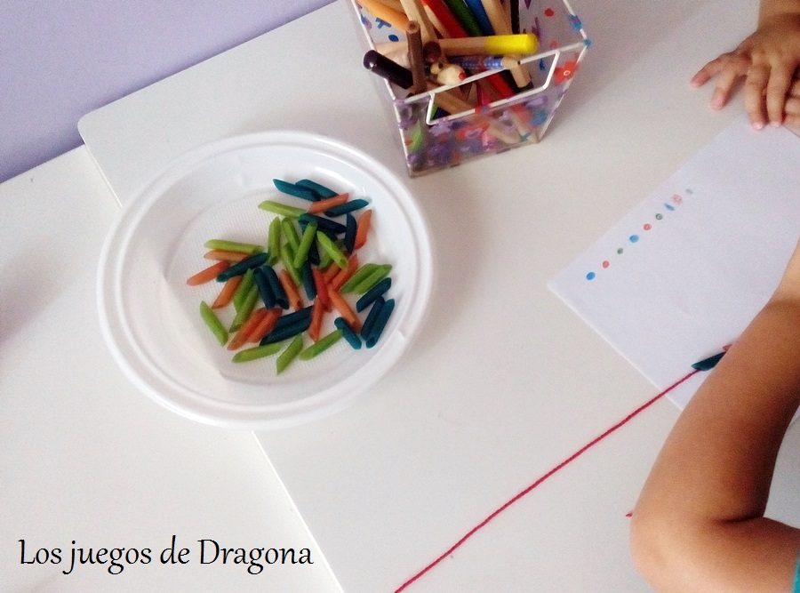 Para hacer esta actividad previamente deberéis tener preparados los macarrones. Para darles color meted un puñadito en una bolsa, añadir vinagre (dos o tres cucharadas) y colorante alimentario. Dejad en remojo bastante rato (agitar de vez en cuando) y por último sacar los macarrones y dejarlos secar (estarán un poquitín blanditos, pero al cabo de un rato se secan y quedan de nuevo duros ¡y con color!)