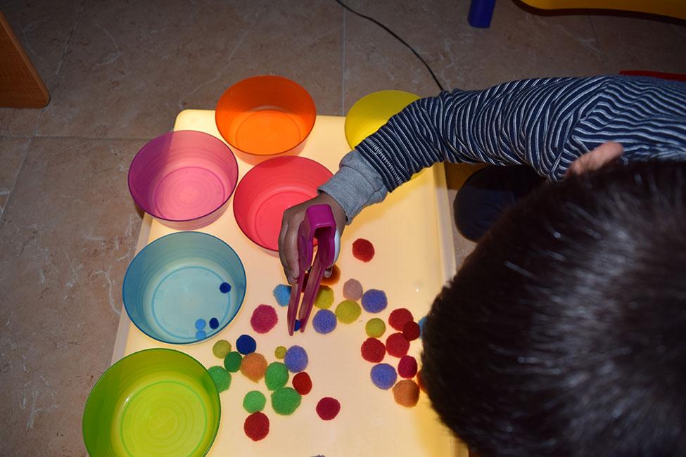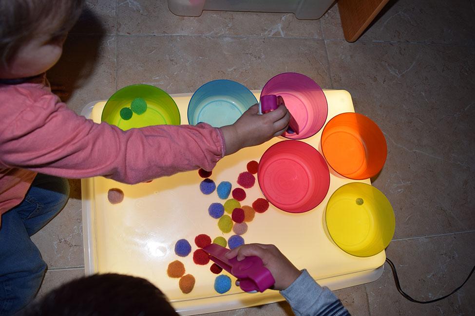 Otro juego que hemos puesto en práctica es el de clasificar pompones. Con unos cuantos boles de colores del Ikea (sección infantil), pompones de colores de un bazar y unas pinzas, podéis ofrecerles un juego de clasificación muy divertido, para trabajar también la motricidad fina con las pinzas.