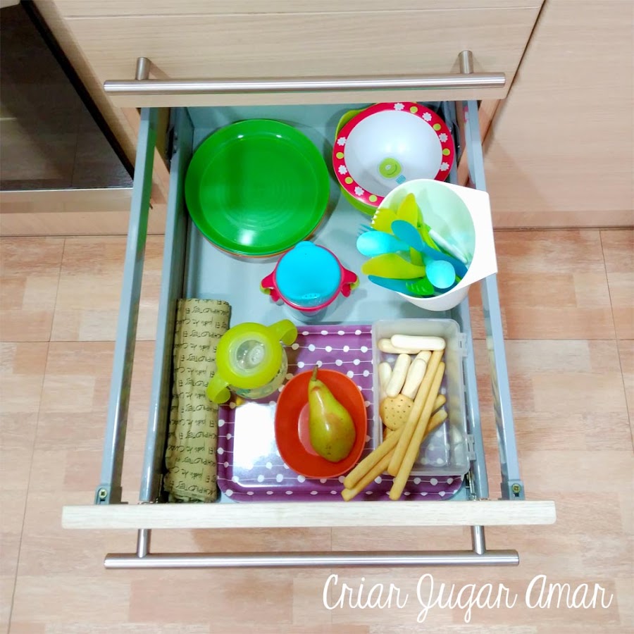 Desde hace semanas me he dado cuenta que Marc cotillea mucho por la cocina abriendo cajones y armarios para inspeccionar lo que hay dentro, de hecho por abrir, ¡abre hasta el congelador! que no veas la gracia que me hace cuando llego a la cocina y... ¡sorpresa! el congelador abierto de par en par desde a saber cuando! por eso he decidido que es el momento de prepararle un espacio con sus útiles y alimentos para picar para que pueda acceder a ellos siempre que quiera.