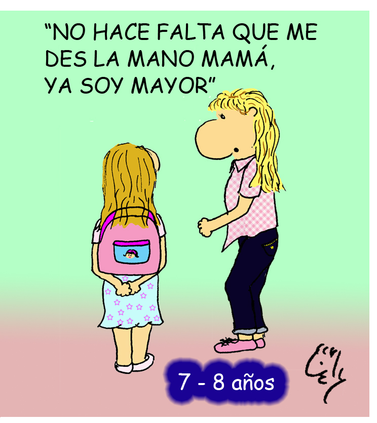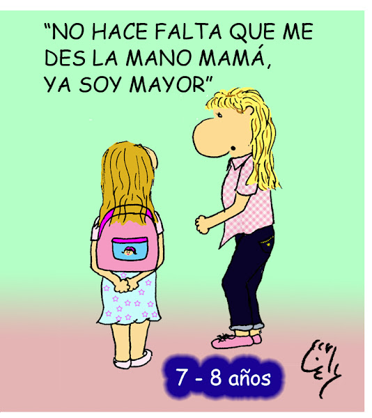 7 - 8 años: Empiezan a evitar algún que otro contacto físico con la madre. Ese contacto indicaría que aún son pequeños. Y ellos empiezan a sentirse mayores. Andando por la calle te dan la mano sin problemas pero...¡nunca en su entorno del colegio!.