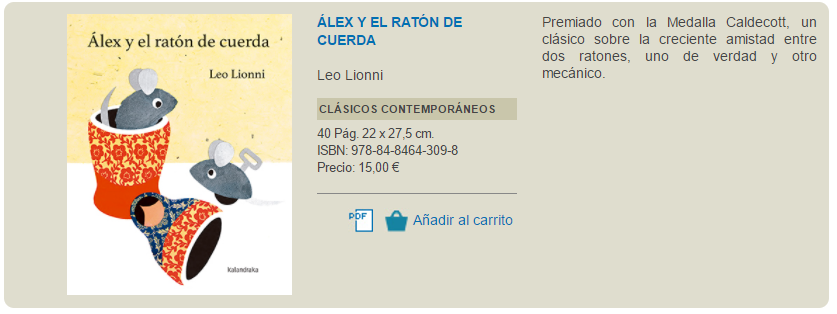 Esta técnica es la que caracterizó durante toda su obra al gran Lionni, todo un clásico de la literatura infantil, del que también se puede leer libros como Frederick, Pequeño azul y pequeño amarillo, Nadarín y Colores, estos últimos también editados por Kalandraka.