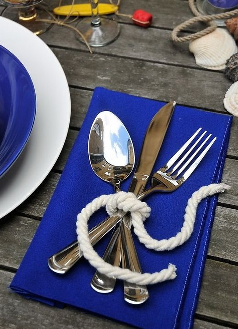 Fundamental, si puedes, es poner el mantel o un camino de mesa a rayas azules y blancas. Si no es posible juega con el azul, el blanco y el rojo para conseguir ese efecto Marinero.