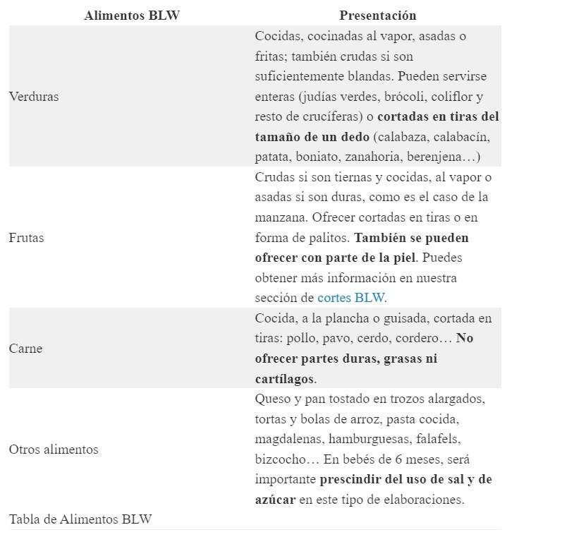 A continuación te mostramos una tabla de alimentos BLW que te ayudará en la presentación de sólidos a tu bebé de 6 meses.