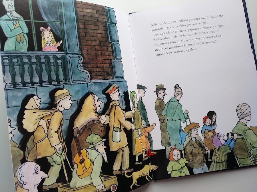Mientras tanto, los ricos miraban desde sus mansiones. Tomi Ungerer, autor francés de este libro, ha realizado una nueva versión del clásico cuento de La cerillera de Christian Andersen, resaltando los peores defectos del ser humano: autoritarismo, intolerancia, avaricia, codicia, agresividad, crueldad, oportunismo, egoísmo, arrogancia, elitismo, excesos materialistas, consumismo, y mucho más.