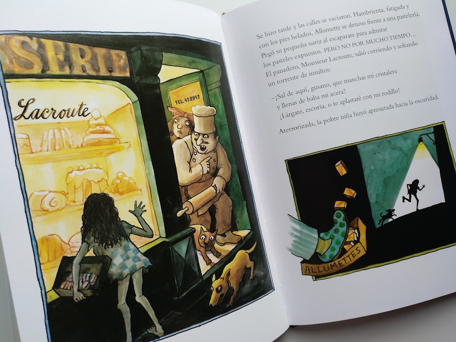 La protagonista de esta historia es la pequeña Allumette, una niña pobre, que no tiene apenas ropa, que vive en la calle pasando muchas necesidades y cuya dedicación es vender cerrillas. Además nadie quiere acercarse a ella ni ayudarla, siempre que pide ayuda la echan sin reparo alguno y utilizando muy malas formas.