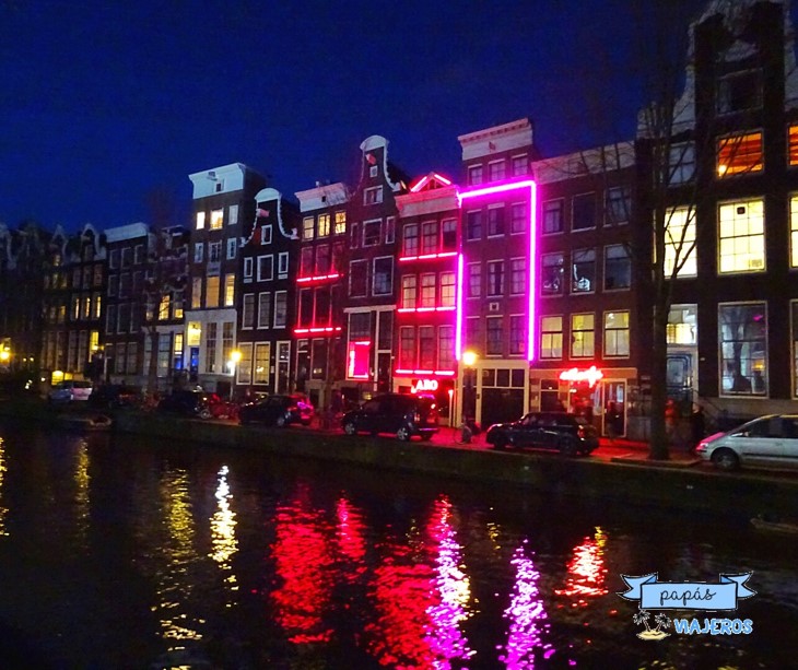 Ya anochecía y decidimos ir a ver el Barrio Rojo de noche. Sí, ibamos con los niños, pero he de decir que yo este barrio me lo imaginaba de otra manera. En plan pilinguis en escaparates gigantes, despiporre por las calles, y nada de eso, ellas están en callejones, en escaparates que son puertas transparentes, es decir, que si no pasas por esos callejones no se ve nada de nada. Además eran las 6 de la tarde así que todo muy correcto.