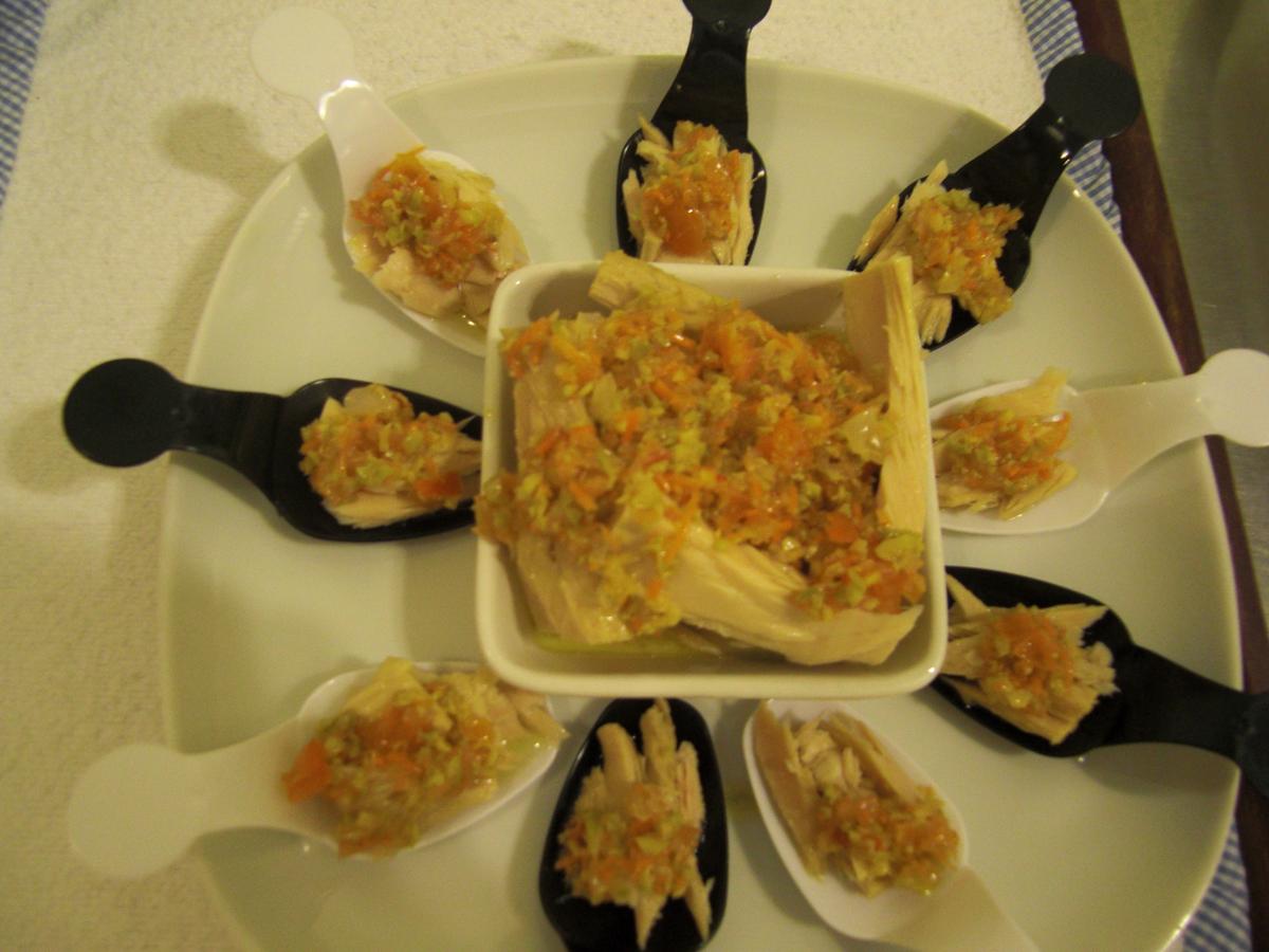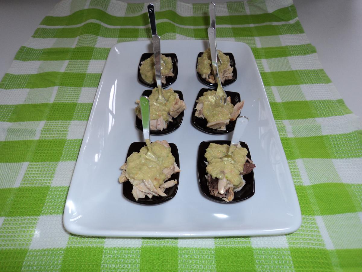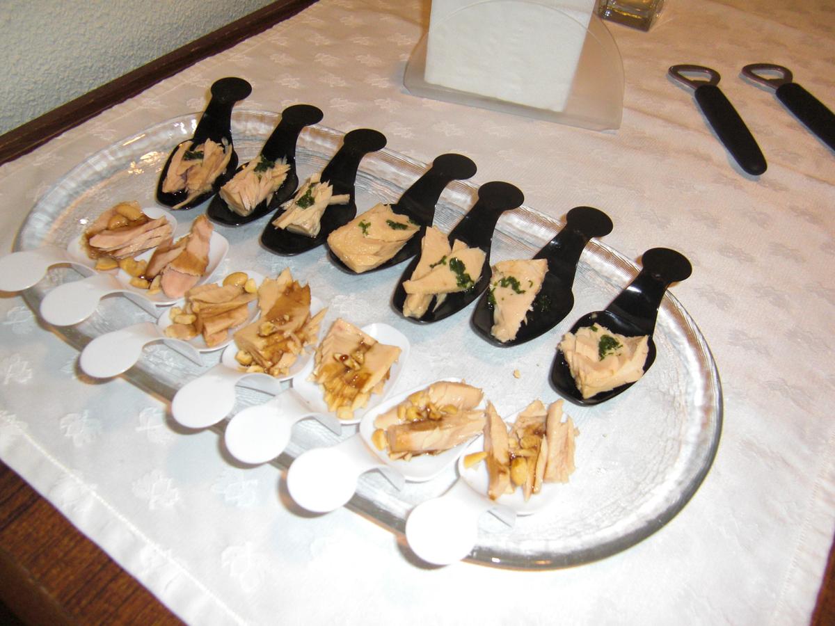 Unas cucharillas con atún y vinagreta de frutos secos y otras con aceite y perejil.