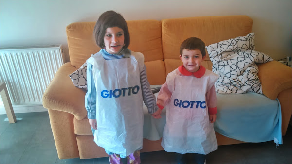 Tengo uno de esos babis sin mangas de plástico para pintar, pero como no tienen mangas yo les meto una bata debajo por si las moscas, que cuando se les cae el pincel o pintura por la mesa, se ponen las mangas de la ropa muy sucia.