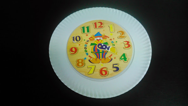 Cogemos el reloj de puzzle. También nos serviría uno de cartulina o de papel que nos hayamos imprimido. Lo colocamos en el centro del plato y lo pegamos.