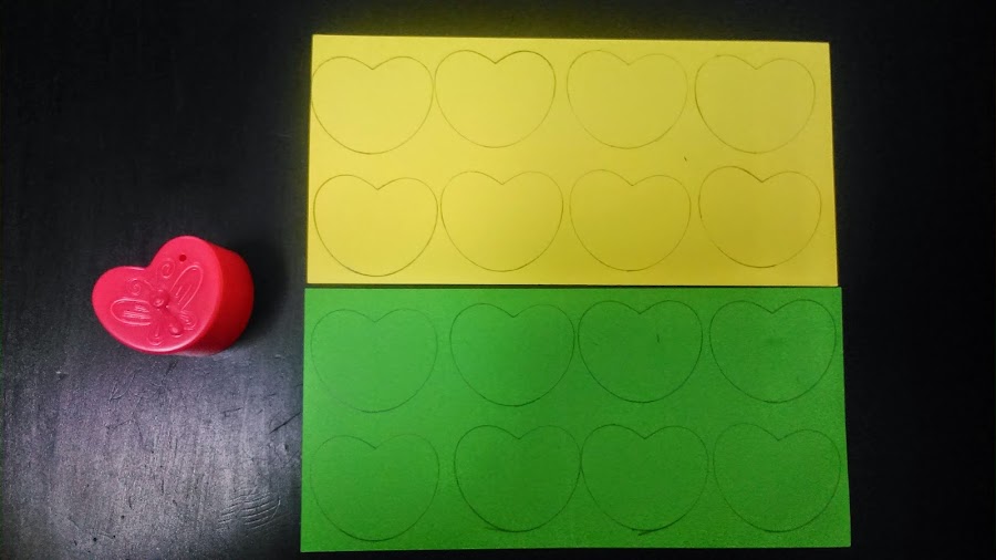 Cogemos cartulina de dos colores y un molde que nos sirva para marcar. Yo lo he cogido en forma de corazón, pero podéis utilizar con cualquier forma que os guste.