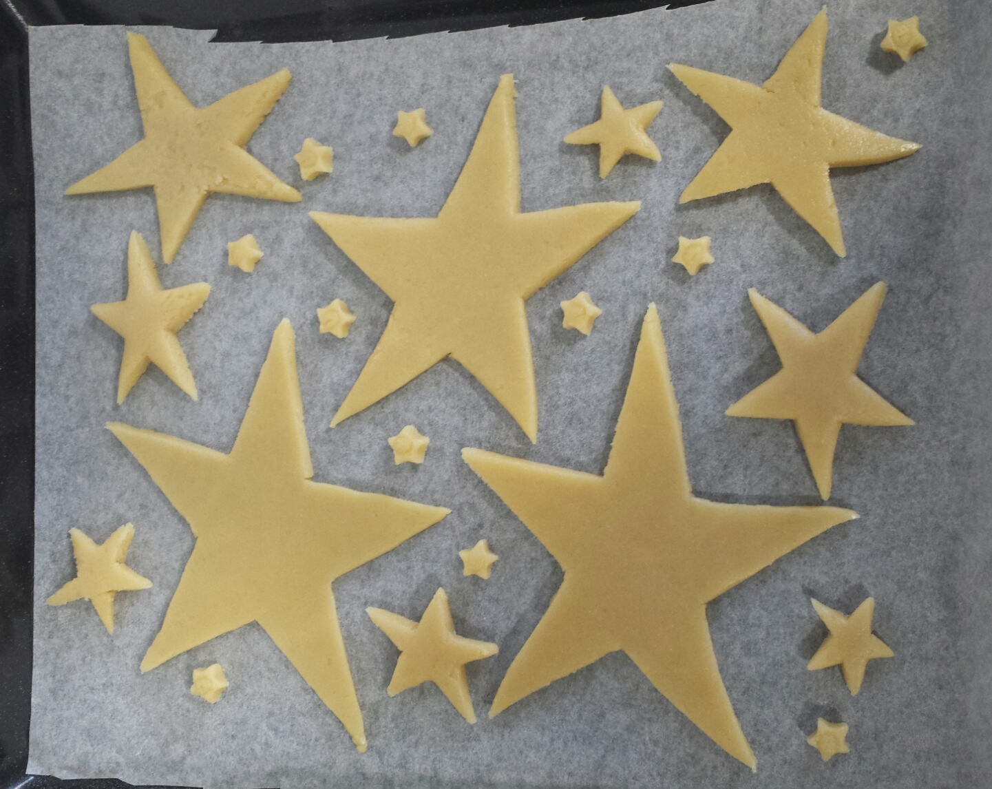 Estirar la masa con ayuda de un rodillo y con moldes de distintos tamaños hacer las estrellas. Intentar que el grosor de las estrellas sea el mismo.