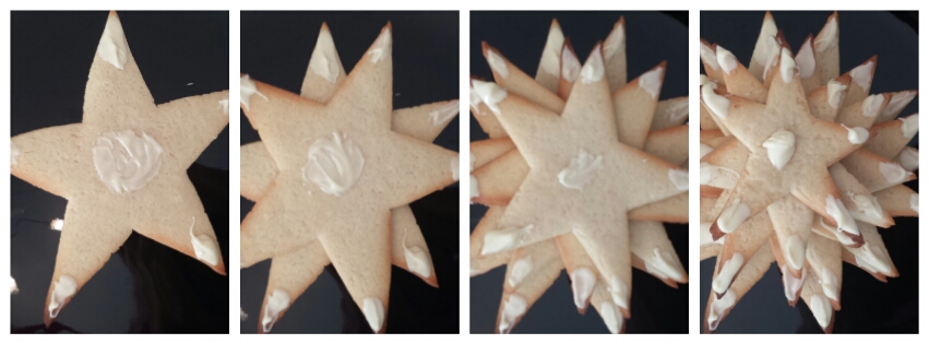 Hornear unos 10-12 minutos a 180º . En cuanto el borde empiece a estar dorado sacarlas.Ir colocando las estrellas de mayor a menor tamaño una encima de otra y decorando con el chocolate derretido.