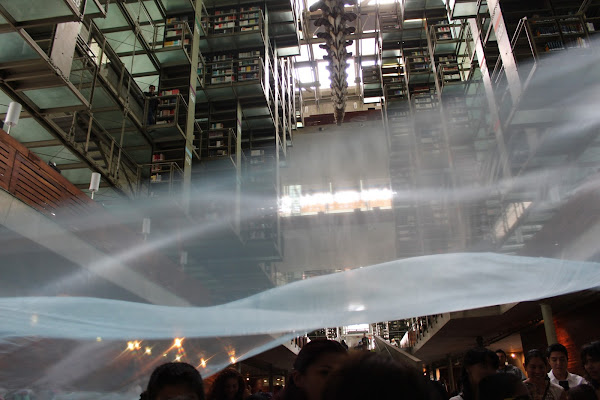 Finalizamos el taller recostandonos en la alfombra admirando el hermoso esqueleto de la ballena que esta colgado en el patio interno principal de la Biblioteca Vasconcelos, imaginandonos estar en el oceano, mientras las talleristas pasaban sobre nosotros una tela traslucida que le daba ese toque mágico al momento.