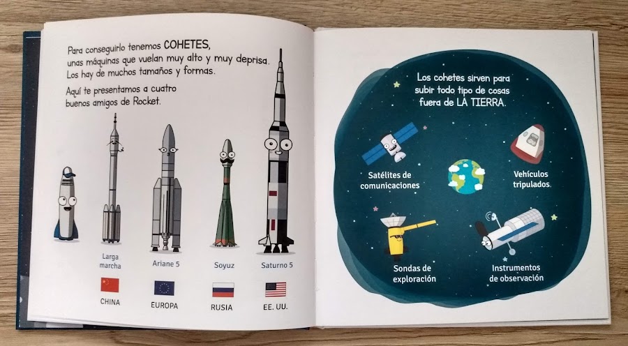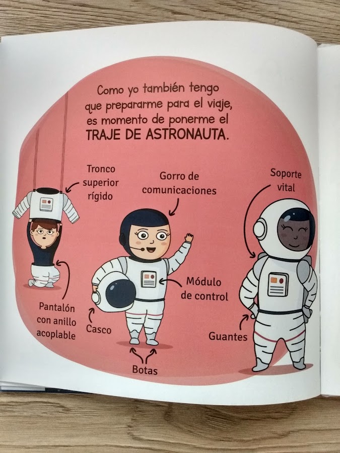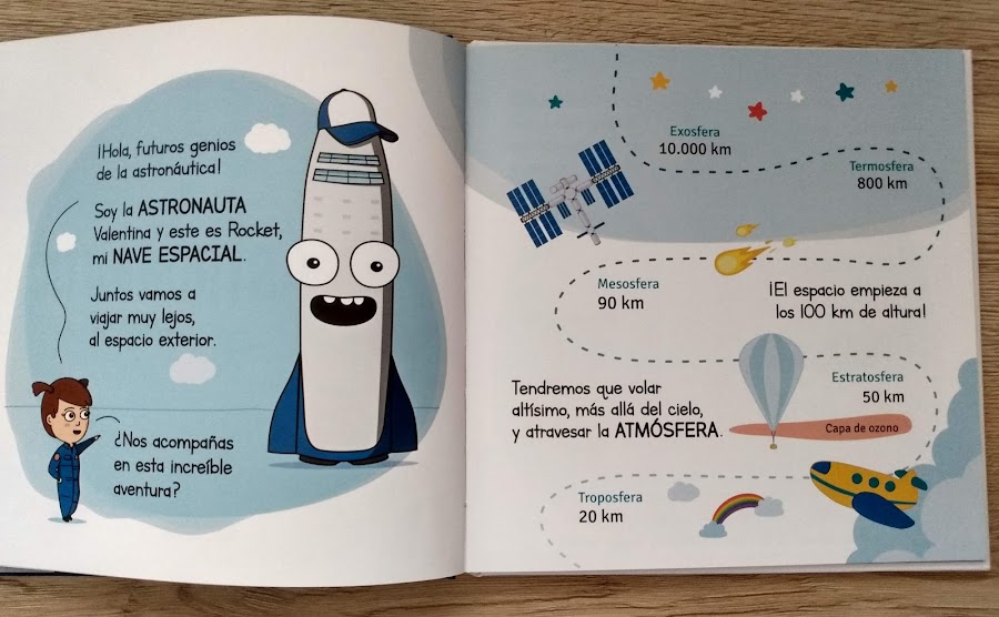 La idea de explicar conceptos, en principio tan complejos, como la astronáutica, la genética o la física cuántica a los niños más pequeños, me parece genial, de verdad que es algo que me entusiasmaba. De hecho, cuando el libro en cuestión llego a mi, había estado buscando un libro que explicase un poco todo el tema espacial a I ya que estaba en un momento de gran fascinación por las estrellas, planetas, cohetes y cualquier cosa relacionada con el espacio. El problema es que a pesar de que la idea está muy bien, no siempre me parece que este adaptado para niños ya que en algunas ocasiones, el vocabulario es muy técnico y no se explica el significado. No se si habéis intentado explicarle alguna vez a una niña de 4 años la diferencia entre la Mesosfera y la Termosfera basandose principalmente en los kilometros de distancia de la superficie terrestre pero yo lo he hecho con alumnos/as de 11 años y no es nada fácil (ni os cuento con una de 4 años).