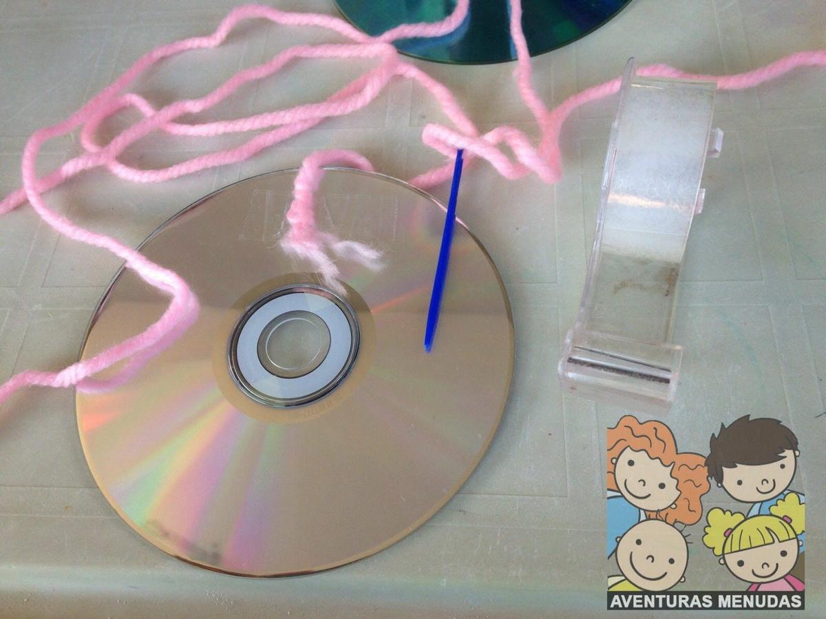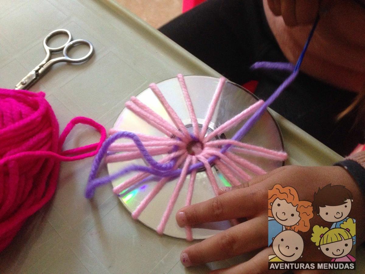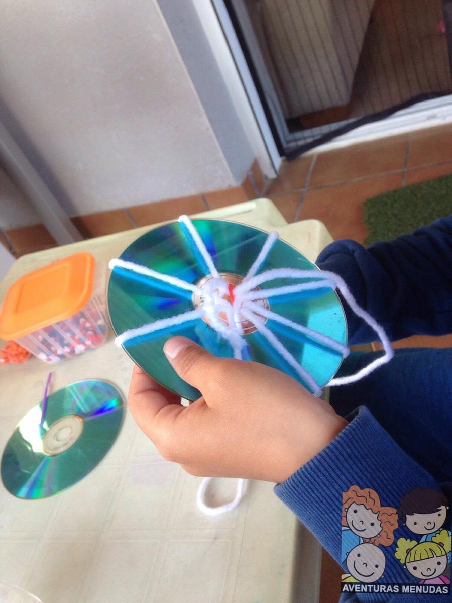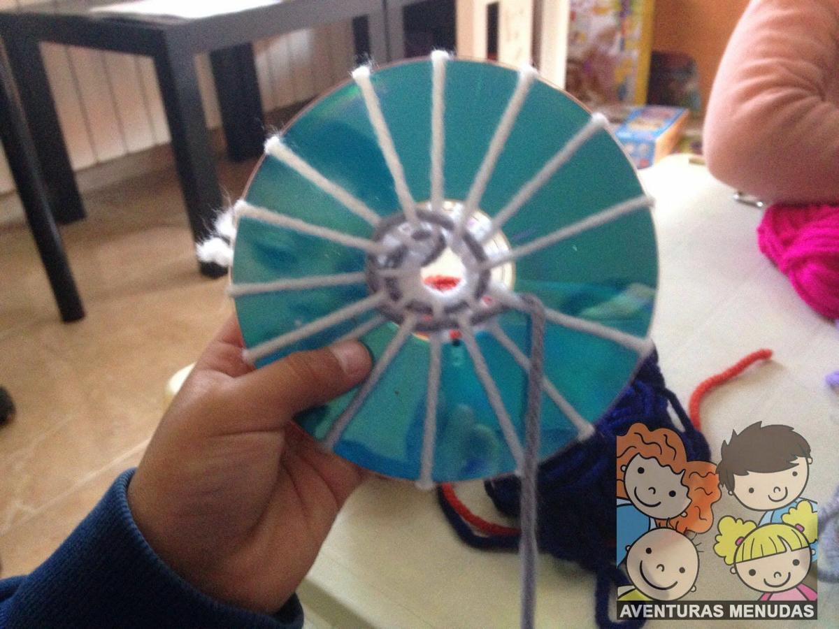 Los peques tienen que pasar por el agujero central del cd la aguja con la lana un número de veces impar. Cuantos más “ejes” tengan mejor, aunque tampoco se lo compliquemos demasiado, según la edad pondremos más o menos, pero eso sí, siempre impares.