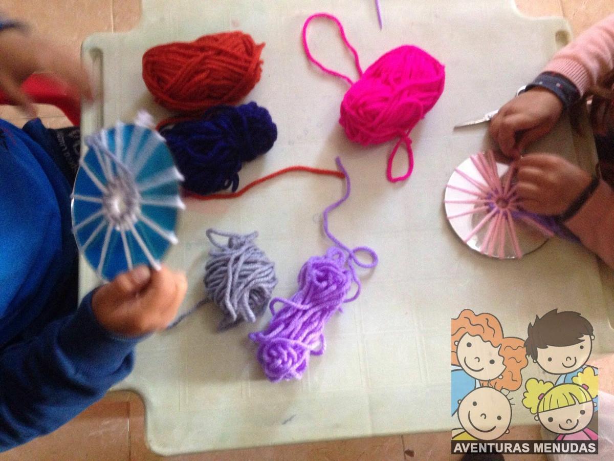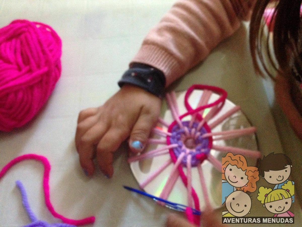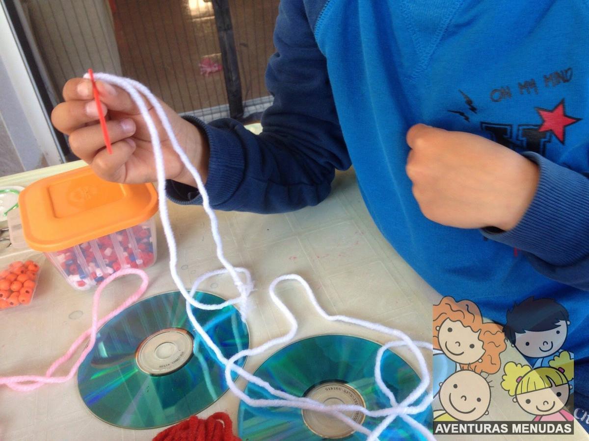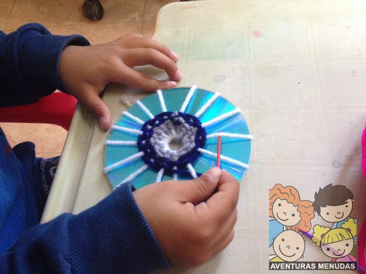 Los peques tienen que pasar por el agujero central del cd la aguja con la lana un número de veces impar. Cuantos más “ejes” tengan mejor, aunque tampoco se lo compliquemos demasiado, según la edad pondremos más o menos, pero eso sí, siempre impares.