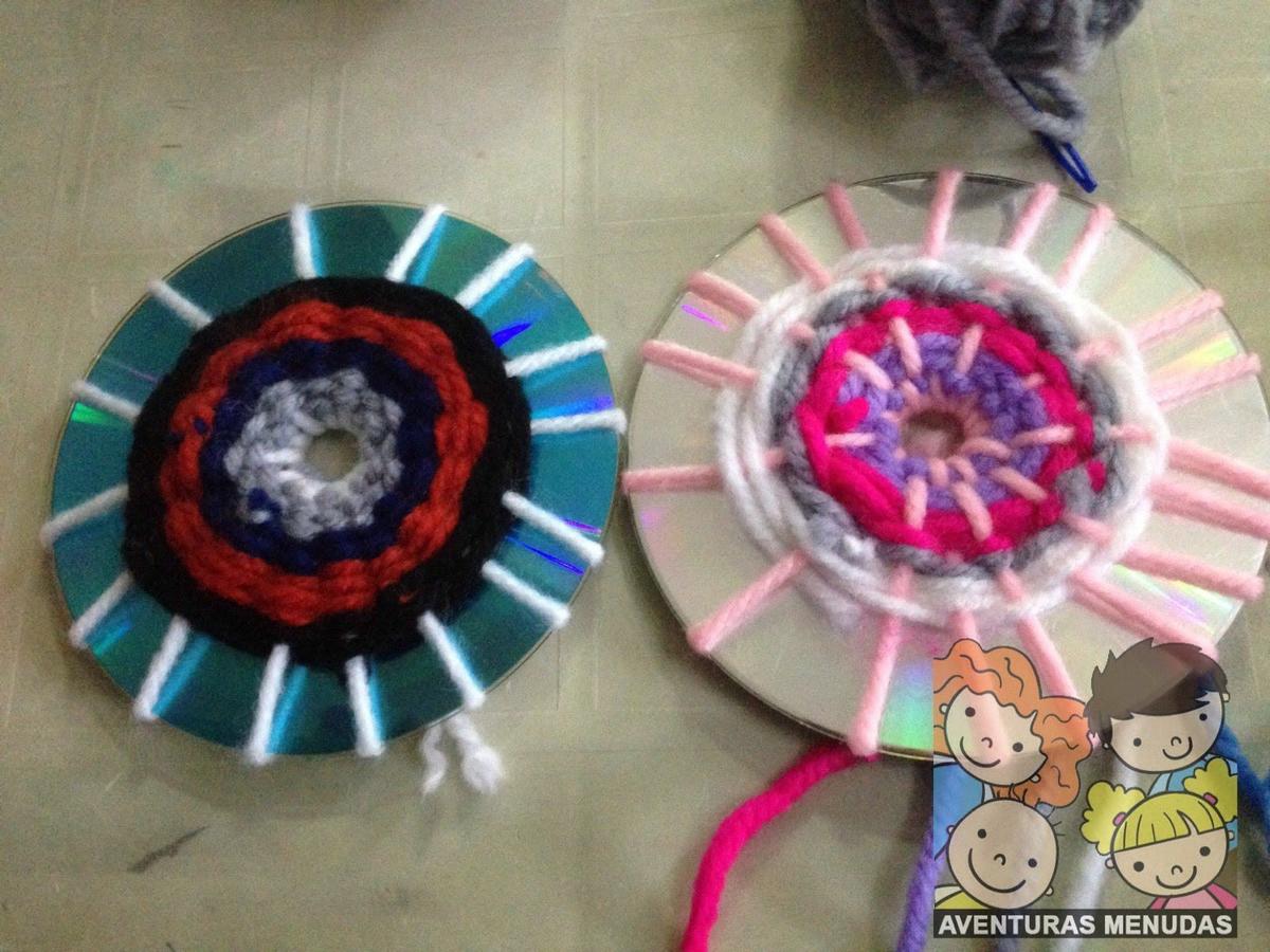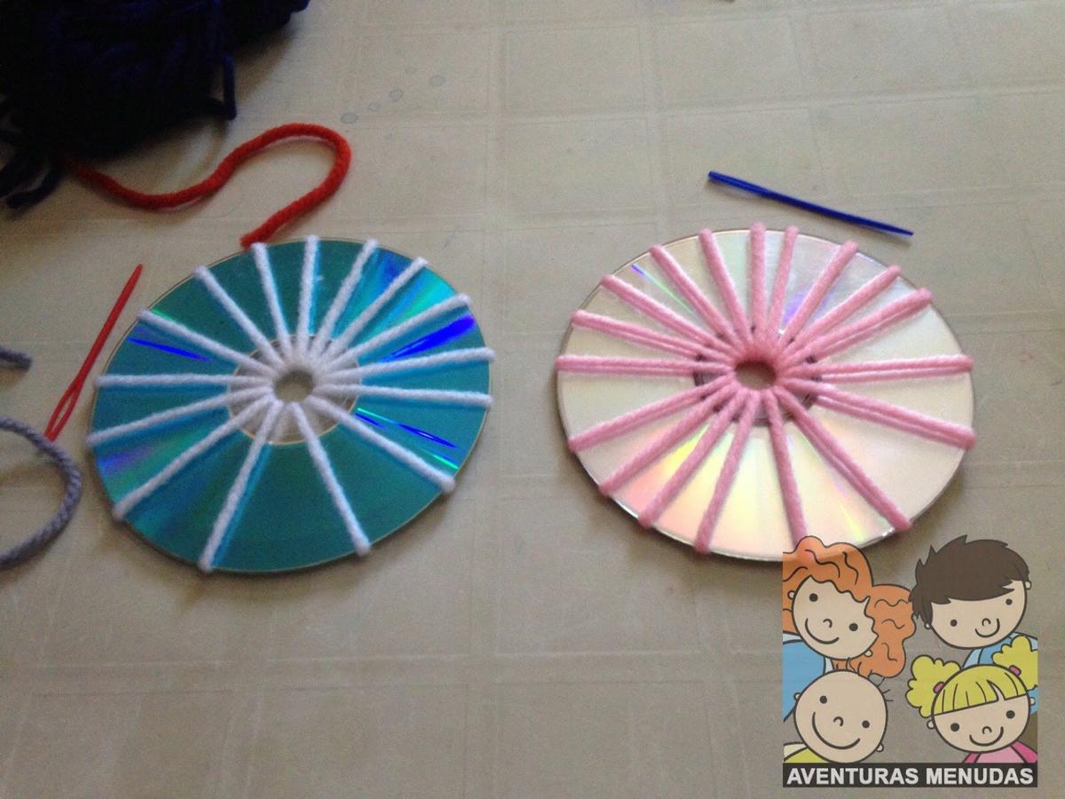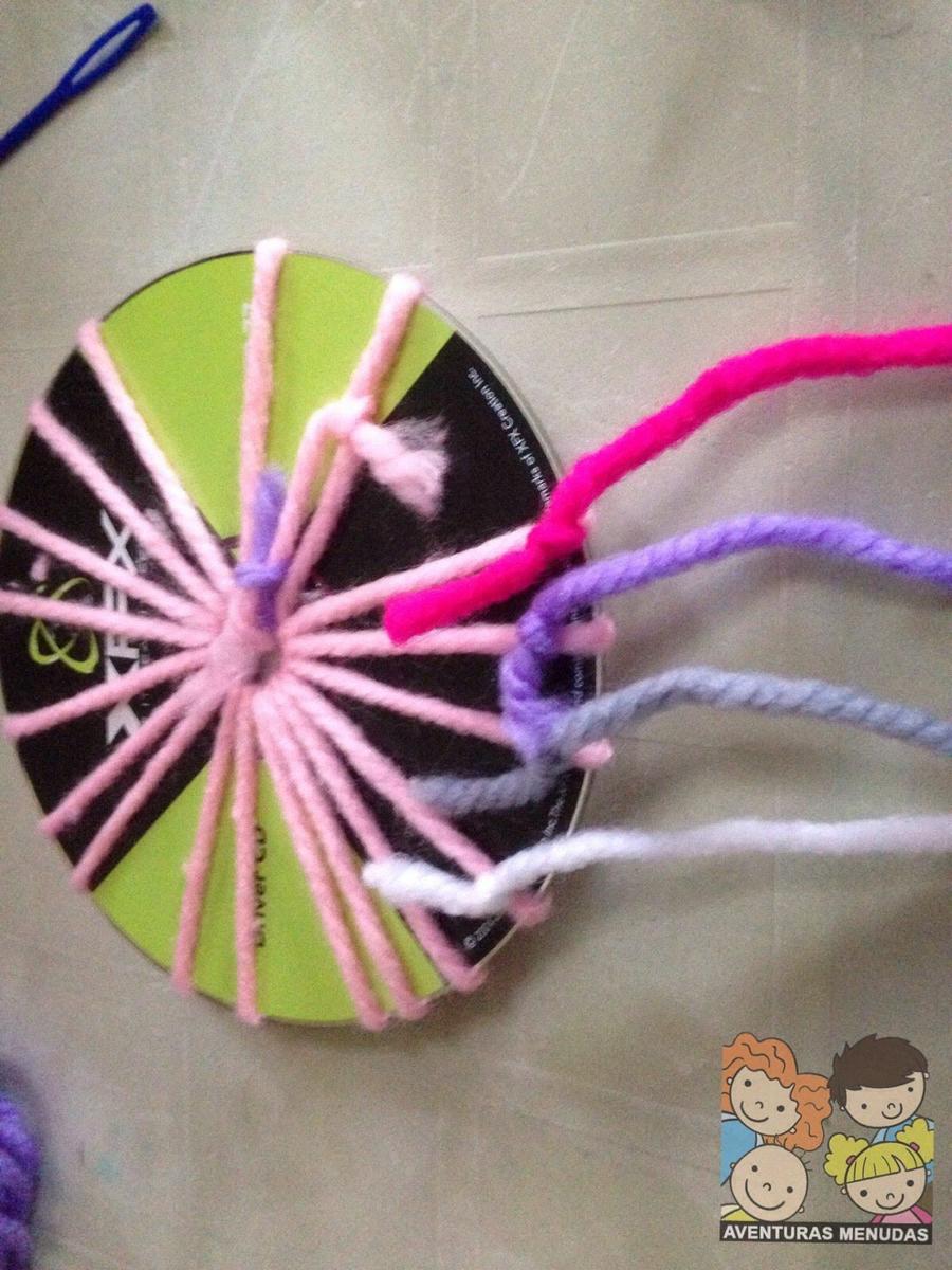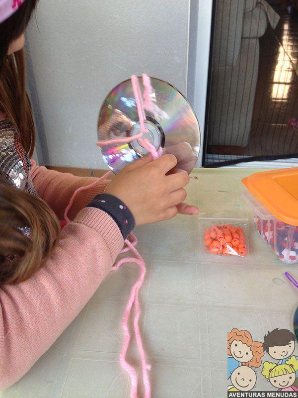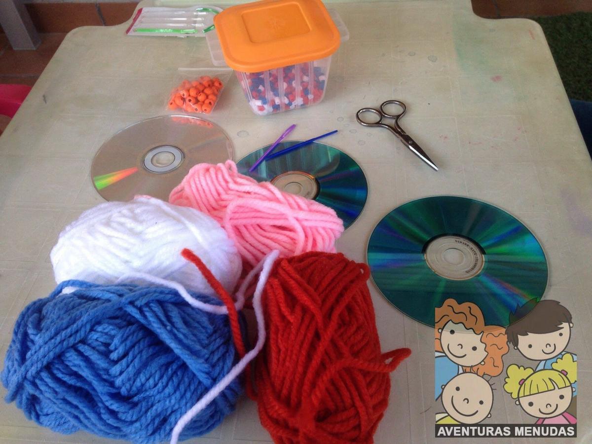 Los peques tienen que pasar por el agujero central del cd la aguja con la lana un número de veces impar. Cuantos más “ejes” tengan mejor, aunque tampoco se lo compliquemos demasiado, según la edad pondremos más o menos, pero eso sí, siempre impares.