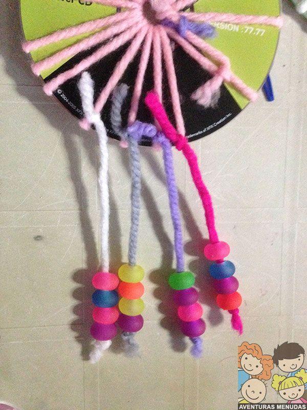 Lo siguiente se eligen los colores de lana con lo que se quiere hacer los extremos que llevarán los abalorios y colgarán del cd. Nosotros hemos puesto cuatro y de diferentes colores, pero podéis poner los que queráis y todos de un color o también variados. Eso cada uno como le guste. Atamos cada trozo de hilo por detrás del cd y dejamos y trocito largo colgando.
