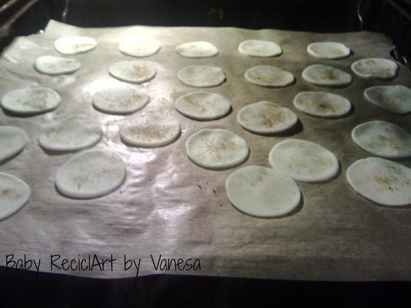 Se estira un poco la masa y se corta en círculos o cuadrados de tamaño aprox. de media galleta maria y los horneamos a 180 grados unos 15 minutos.